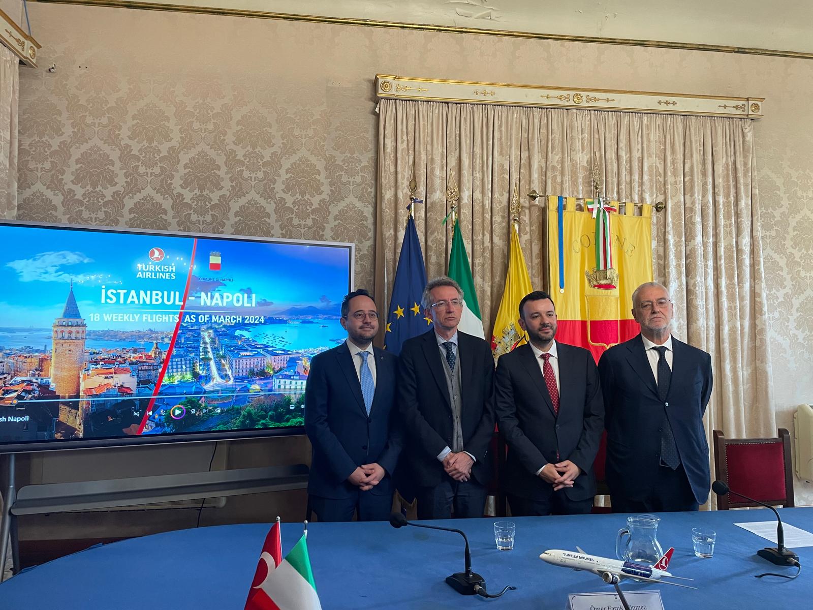 Thanks to the efficient connections offered by Turkish Airlines, passengers can both visit the only city in the world belonging to two continents and fly over 345 destinations in the world. The increase of the frequencies - 18 per week - has been announced by the management team of airline during of a press conference  in the Sala Giunta of the Municipality of Naples, at the presence of Mayor Gaetano Manfredi and GESAC CEO Roberto Barbieri.