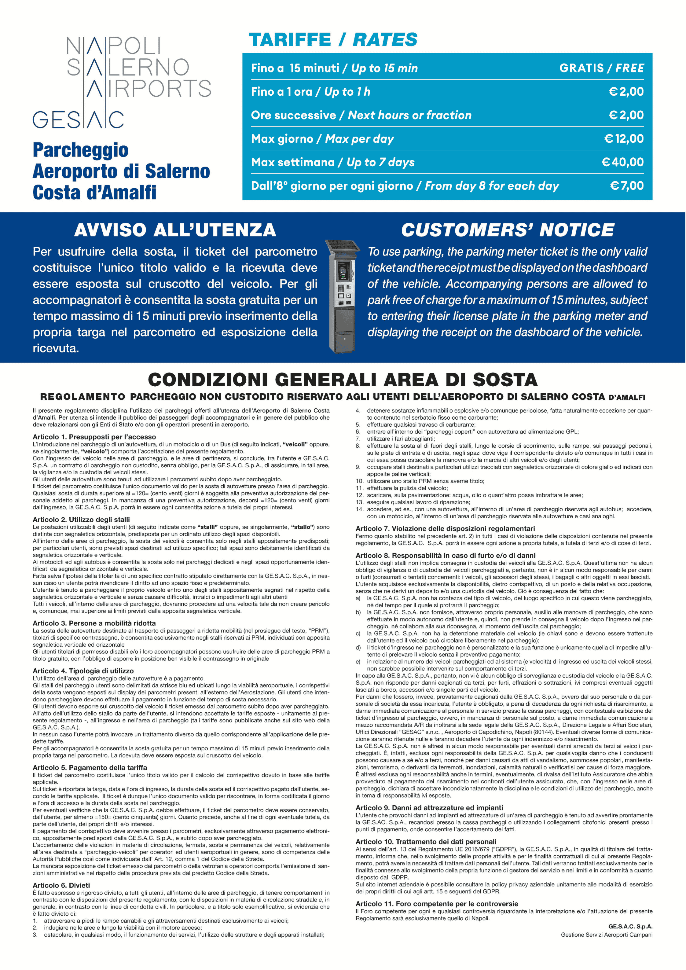 Posti auto fronte terminal con pagamenti in contanti ed elettronici presso il parcometro presente nell’area.