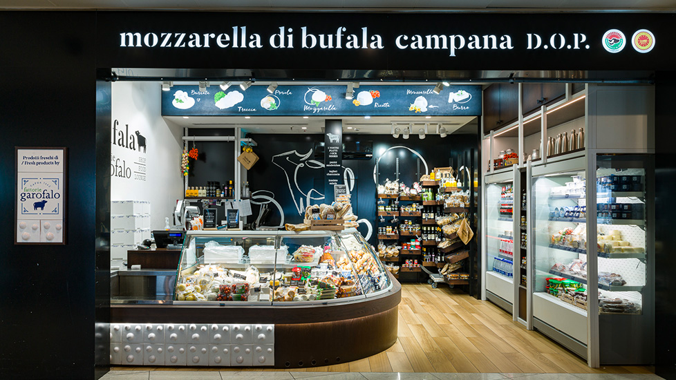 Il punto vendita si ispira a una moderna salumeria gourmet senza però perdere la tradizione delle antiche latterie italiane, con il bianco della mozzarella, il nero del manto bufalino ed elementi naturali di design che attribuiscono una forte identità al brand.